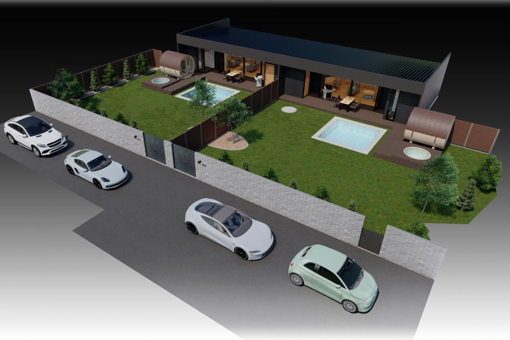 902.96㎡(約273.6坪)の敷地に、延床面積67.1㎡のヴィラを2戸配置しています。各戸は十分なプライバシーを確保しながら、ゆとりのある空間を提供します。