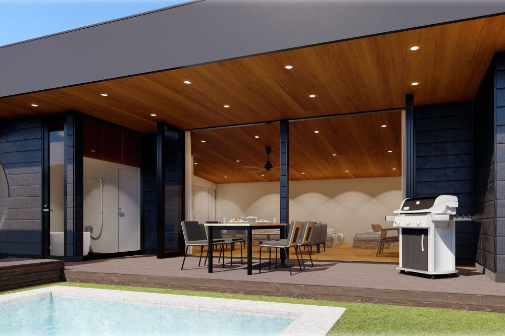 屋根付きの開放的なデッキテラスは幅約11メートルに及び、天候の悪い日には軒先でBBQをお楽しみいただけます。