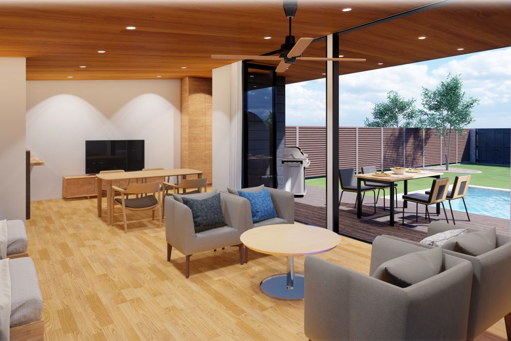 リビング、デッキテラス、プールといった主要な空間は、広大なドッグランを兼ねた人工芝の庭を目前に望むよう設計されており、愛犬との一体感を常に感じられる開放的な空間が特徴です。