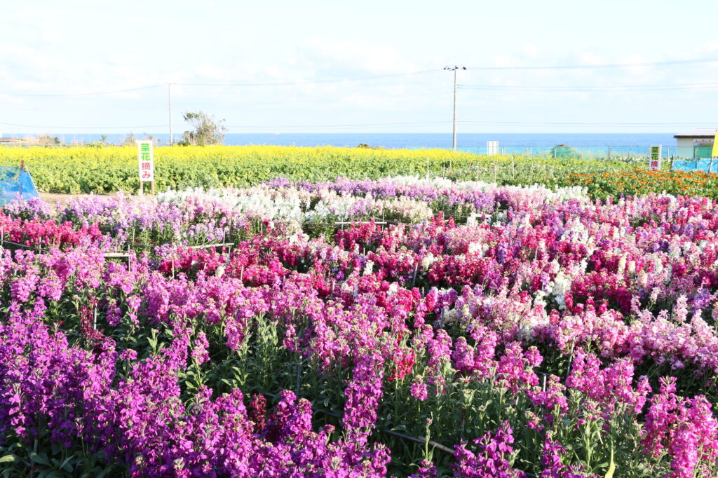 色鮮やかなオーシャンブルーの海、砕ける白い波、そして一年を通して咲き誇る色とりどりの花畑に囲まれた白間津地区。