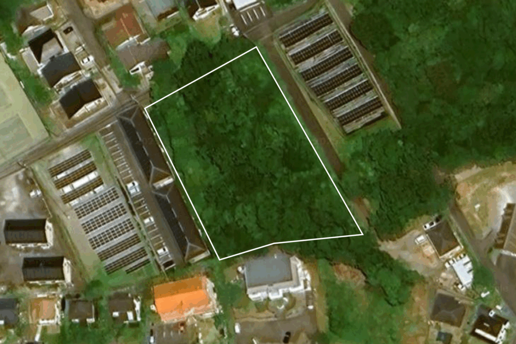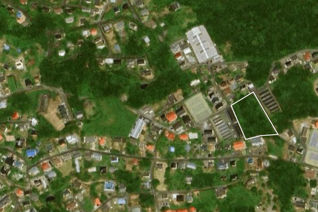 本物件は、伊豆高原の八幡野地区に位置する、約998坪(約3,300㎡)の広さを誇るフラットな整形地です。幅員5mの公道に約40mにわたり接道する台形型の形状は、効率的な施設開発に最適な条件を提供します。周辺は高原の森と住居、落ち着いた佇まいの別荘、コテージ、保養所、カフェ、美術館が建っています。