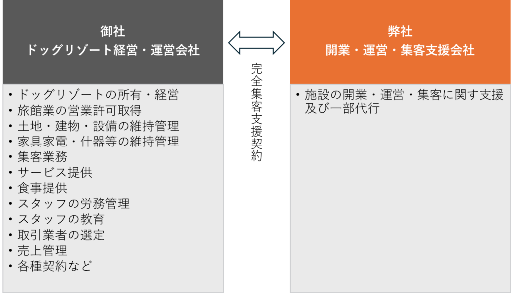 御社がドッグリゾートの経営から運営まで全てを行い、私たちは開業支援、開業後の運営及び集客について全面的に支援します。